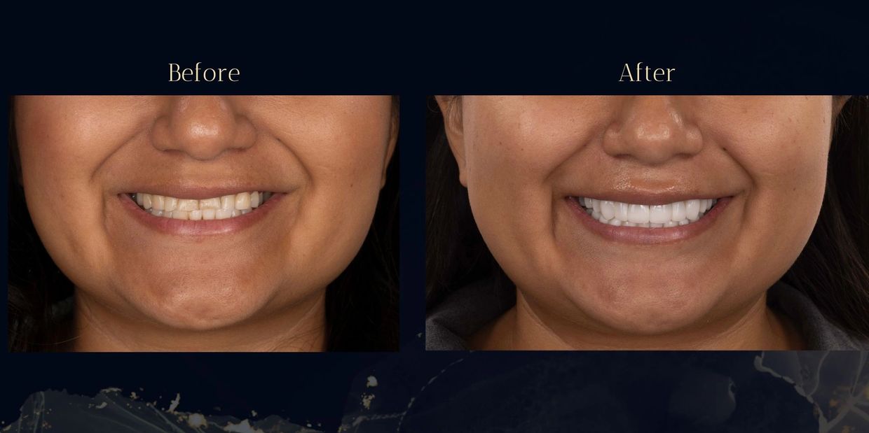 Fortunately, she did not need to sacrifice any tooth structure in order to enhance her smile. Our No-teeth-preparation veneers were created by adding white filling material directly onto her teeth.